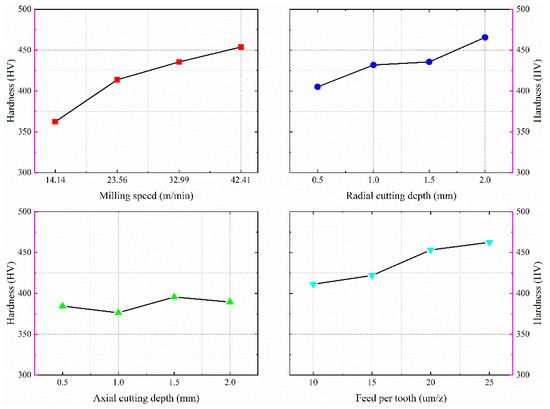 According to the experimental results, the variation of the surface microhardness with the machining parameters under dry milling condition can be obtained as shown in Figure 20. The microhardness of titanium alloy TC21 becomes larger with the increase of milling speed, radial cutting depth, and feed per tooth, while the effect of axial cutting depth on the microhardness of the machined surface is small. The milling force increases with the increase of axial cutting depth, but the increase of axial cutting depth also leads to the increase of milling area in the same proportion. The cutting force and heat per unit area vary little. Thus, the axial cutting depth has little effect on the hardness of the milled surface. With the increase in milling speed, radial cutting depth, and feed per tooth, the milling temperature will increase accordingly, which will lead to an increase in softening effect. However, the milling heat also causes an increase in the oxidation of titanium elements. Meanwhile, the elongation and fibrillation of the internal grains of the material will become more prevalent. This leads to a greater hardening effect than softening effect on the workpiece surface. As a result, the surface hardness becomes greater with increasing radial cutting depth, milling speed, and feed per tooth.
