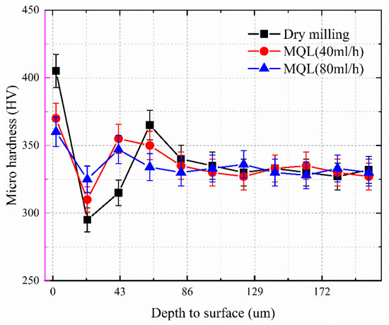 In this section, the hardness distribution of the titanium alloy surface is measured using the cross-sectional method. The milled TC21 workpiece is cut to obtain a cross-section perpendicular to the machined surface, and the cross-section is ground using sandpaper and finely polished. Figure 21 shows the hardness distribution of the surface layer for different machining methods (dry milling, MQL1 (40 mL/h), MQL2 (80 mL/h)). MQL can reduce the temperature in the machining area and effectively mitigate the thermal softening effect of the machined surface. The lubricant can effectively improve the contact condition of the milling cutter and workpiece and reduce the deformation degree of the machined surface. Meanwhile, the lubricant film attached to the workpiece surface prevents the titanium element from coming into contact with the air, thus inhibiting the formation of a dense oxide film on the workpiece surface. The reduction of surface hardening caused by the weakening of material deformation and chemical reaction is stronger than the strengthening of surface hardening caused by the weakening of thermal softening. Thus, the hardness of the machined surface decreases after using MQL compared to dry milling.