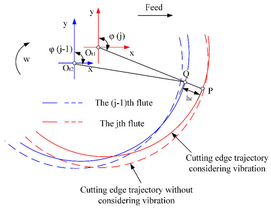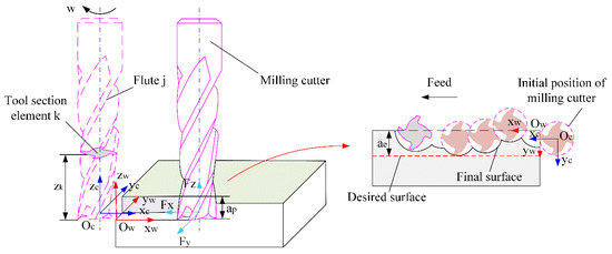 The geometric structure and cutting trajectory of the milling cutter is mapped on the workpiece surface, which is the microscopic topography of the machined surface. Cutting parameters, workpiece material, vibration, lubrication methods, and lubrication parameters can affect the microscopic topography of the machined surface. The machined surface defects of milled workpieces include feeding tool marks, scratches, plastic deformation, scaly spurs, and secondary material deposition. In particular, feeding tool marks are inherent defects of milled surfaces [26,27,28].