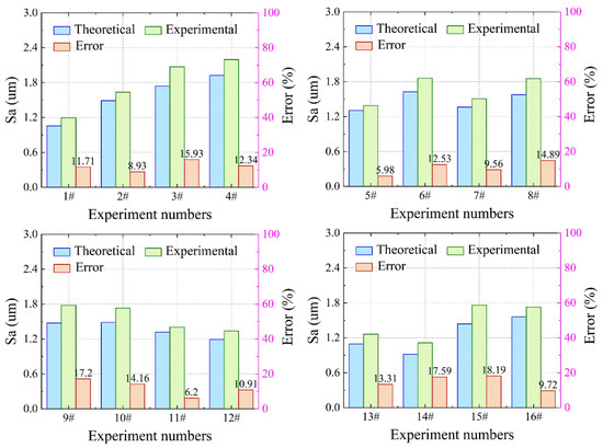 The comparison between the theoretical and experimental values obtained by the surface roughness model is shown in Figure 27. From Figure 27, the theoretical and experimental values are in good agreement. In the orthogonal experiments, the maximum value of error occurs in one of the experiments with an error value of 18.19%. The minimum value of error is 5.98%. The error values of all experiments are within 20%. In Figure 27, the theoretical value of surface roughness differs from the experimental value as the milling speed increases. This may be because the vibration frequency of the milling cutter-spindle system at this milling speed is close to the intrinsic frequency of the machine system. The vibration amplitude and deflection deformation of the milling cutter increases accordingly. This leads to a large deviation of the tool trajectory from the theoretical trajectory. Thus, the prediction accuracy of the surface roughness model decreases as the milling speed increases. It is worth noting that the theoretical values of surface roughness are all smaller than the experimental values because this model does not consider the effects of surface burrs and tool wear.