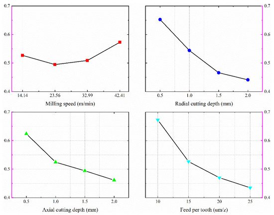 According to Table 6, the mean response diagram of the gray correlation for each factor can be obtained (see Figure 28). From Figure 28, it can be seen that the combination of process parameters that satisfies both roughness and milling force F with STB characteristics is . Combining the contents of Table 3, the milling speed is 42.41 m/min, the radial and axial cutting depths are 0.5 mm, and the feed per tooth is 10 μm/z. The combination of parameters is not included in the orthogonal experiments table (Table 4).