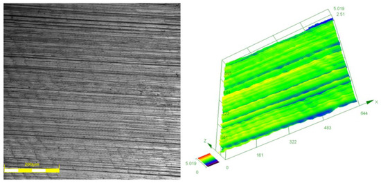 The surface topography of the machined workpiece at different axial cutting depths is shown in Figure 11. When the axial cutting depth is 1 mm and 2 mm, there is no significant difference in surface morphology. It indicates that within the experimental parameters, the axial cutting depth has little effect on the microstructure of the milled surface. Although the increase of axial cutting depth will increase the milling force accordingly, the milling area will also increase proportionally. This causes little change in force per unit milling area after the change in axial cutting depth. Thus, the microscopic topography of the milled surface does not change significantly.