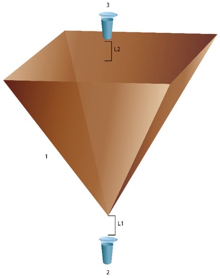 The effects observed herein differ from those of a normally oriented pyramidal structure, which were reported previously []. Such a difference in the effects on the protein solution from oppositely oriented pyramids can be due to the following circumstances: Firstly, a change in the mutual orientation of a pyramid and in the direction of an incident electromagnetic field lead to a different topography of the spatial distribution of the electromagnetic field near the pyramid []. According to the theoretical study by Minin et al. [], the influence of pyramidal structures consists of the induction of changes in the topography of external electromagnetic fields near the pyramid at wavelengths comparable to the size of its face. This takes place at the expense of both refraction and reflection from the face of the pyramid. Moreover, a strong dependence of the effective scattering surface on the angle of incidence on the plane (which can be a model of the base of the pyramid) was shown []. It was emphasized that this effect can be also observed for more complex geometric solids []. Thus, the difference in the effects of pyramidal structures upon their different orientation in space on biological objects was grounded theoretically and confirmed in our experiments with the example of HRP.