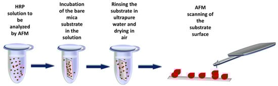 In our experiments, adsorption of the HRP enzyme was performed directly from its solutions on mica substrates following the technique developed by Kiselyova et al. [] analogously to [,,]. The implementation of this technique is schematically shown in Figure 2.