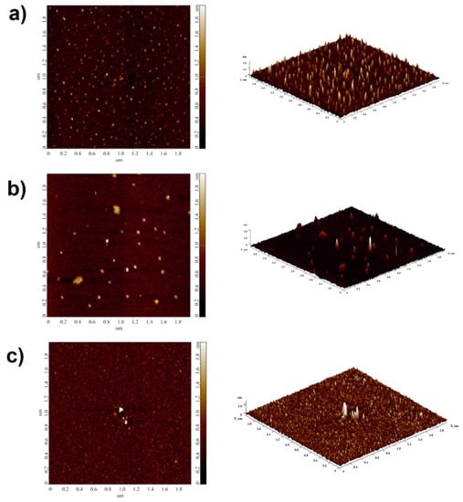 Figure 3 displays typical AFM images (left) and corresponding cross-section profiles (right) of HRP adsorbed on mica from its solutions incubated either 1 cm below the ISP’s apex (Figure 3a), 1 cm above the ISP’s base (Figure 3b) or three meters away from the ISP (Figure 3c; control sample).