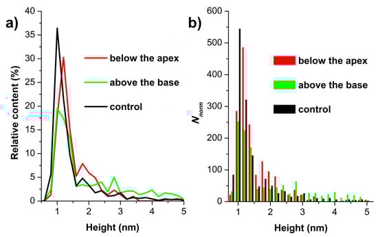 In Equation (1), Nh is the number of AFM-imaged objects with height h, while N is the total number of AFM-imaged objects []. The so-calculated distributions are presented in the form of ρ(h) curves (density function plots []).