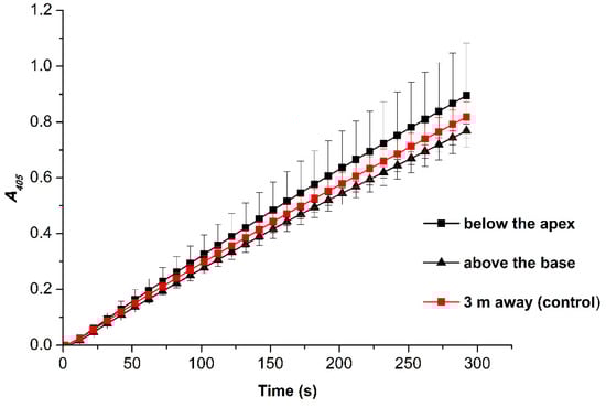 The functional activity of the HRP enzyme was estimated using spectrophotometry in both working experiments (in which the enzyme solution was incubated either at a 1 cm distance below the pyramid’s apex or in the center of its base) and control experiments (in which the solution was kept 10 m away from the pyramid), as described in the Materials and Methods Section. Figure 5 displays the time dependencies of the change in absorbance of 0.3 mM ABTS solution containing 1 nM HRP and 2.5 mM hydrogen peroxide (A405(t) curves).
