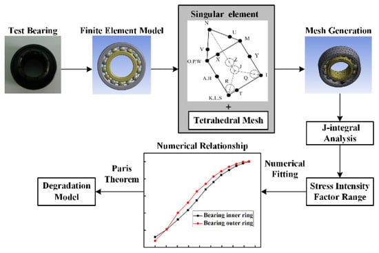 The finite element analysis is used to simulate the crack propagation, and a set of stress intensity factors varying with the crack length are obtained by J-integral analysis to simulate the fatigue crack propagation. The mathematical relationship of with the square root of the crack length is obtained by numerical interpolation fitting. The time-varying physical parameters obtained from the Paris-Erdogan theorem and FEM are transferred to the degradation model of the bearing. The stress intensity factor is taken as the time-varying physical parameter in the bearing degradation model.