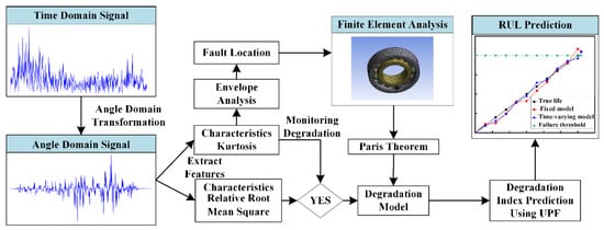 To solve the above problems, this paper proposes a RUL prediction method dealing with rolling bearings under variable rotational speed, based on angular domain transformation and time-varying degradation model parameters. Firstly, the angle domain transform is used to process the original time domain signal and extract the real-time degradation features of bearings. Secondly, a finite element method (FEM)-based time-varying parameter degradation model consistent with the bearing performance degradation state is established. The unscented particle filter algorithm (UPF) is used to estimate the bearing degradation state for predicting its RUL. This method not only alleviates the limitations of RUL prediction methods based on data-driven and physical models, but also predicts the future degradation trend of bearings more accurately.