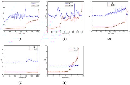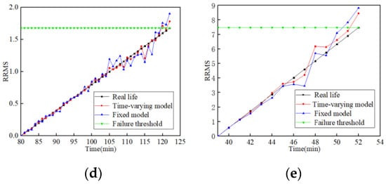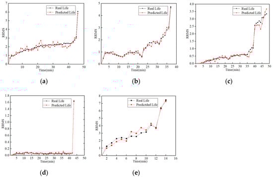 (a) RRMS prediction result of bearing1_1; (b) RRMS prediction result of bearing1_2; (c) RRMS prediction result of bearing1_3; (d) RRMS prediction result of bearing1_4; (e) RRMS prediction result of bearing1_5.