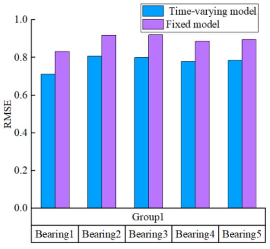 The standard deviation of the state estimation error (RMSE) of the five bearings is calculated as shown in Figure 6. Taking the result of bearing1_1 as an example, the RMSE of the degradation model based on time-varying parameters is 0.7123, while that of the fixed degradation model based on empirical formula is 0.8323. This shows that the performance of the degradation model based on time-varying parameters is better. The state prediction results of the two models are mapped to the RUL of the bearing as shown in Figure 7. The RUL prediction result of bearing1_1 is also taken as an example to illustrate. The RUL prediction error of the degradation model based on time-varying parameters is 10 min, while that of the fixed degradation model based on empirical formula is 16 min. Therefore, the prediction results of the proposed model are more convergent than those of the traditional empirical model. The accuracy is higher and is closer to the actual RUL.