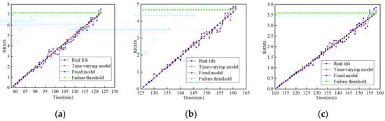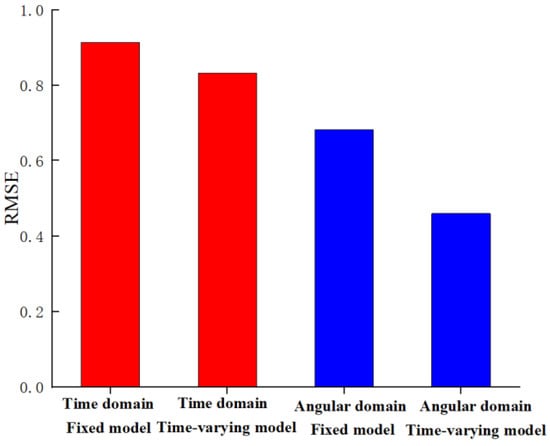 To illustrate the superiority of the bearing degradation model based on time-varying parameters proposed in this paper, RRMS extracted directly from the original time domain was introduced into the bearing degradation model based on the traditional empirical formula. RMSE of state estimation error is obtained as shown in Figure 12. RMSE obtained by directly extracting features from time domain is 0.8327, while the error obtained by extracting features after angular domain transformation becomes 0.2596. Therefore, it can be seen that angular domain transformation has better effect in Processing non-stationary time domain signals with variable rotational speed. RMSE of the degradation model based on the traditional empirical formula is 0.4708, while RMSE of the degradation model based on the time-varying parameters is reduced to 0.2596. Therefore, the degradation model based on the time-varying parameters proposed in this paper is closer to the actual degradation state of the bearing with high prediction accuracy.