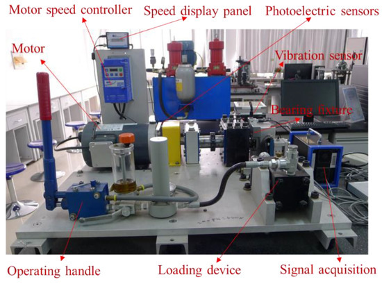 The bearing dataset [35] is a benchmark provided by the Xi’an Jiao tong University (XJTU) and the Sum young Technology Co., Ltd. (SY) (Sum young, Huzhou, China), it is defined as XJTU-SY. As shown in Figure 3, the bearing testbed is composed of an alternating current (AC) induction motor, a motor speed controller, a support shaft, two support bearings (heavy duty roller bearings), a hydraulic loading system and so on. This testbed was designed to conduct the accelerated degradation tests of rolling element bearings under different operating conditions (i.e., different radial force and rotational speed). The radial force was generated by the hydraulic loading system and applied to the housing of tested bearings. The rotational speed was set by the speed controller of the AC induction motor.