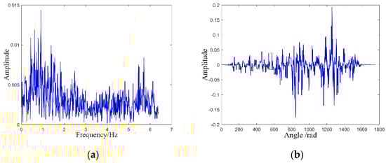 The variable speed experimental data are transformed in the angular domain. The spectrum of the original non-stationary signal is shown in Figure 9a, and the stationary signal after angular domain transformation is shown in Figure 9b.
