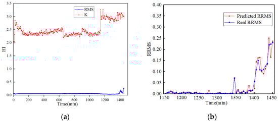 As shown in Figure 10a, the characteristic indexes (kurtosis, root mean square) are extracted from the angle domain signal. The degradation start time of the bearing is 1150 min, and the failure time is 1450 min. The RRMS of each moment was calculated, and the degradation characteristics of rolling bearings were predicted by the method presented in this paper. It was further mapped to the bearing RUL, as shown in Figure 10b.