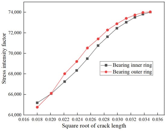 To explain the influence of different fault locations on the stress intensity factor of time-varying model parameters, a plane open crack with length of 1 mm and depth of 1 mm was set in the inner race and outer race of the bearing in FEM. According to the experimental conditions, the inner race of the bearing was fixed, and a radial load of 8500 N was applied to the bearing. The relationship between the stress intensity factor and the square root of the crack length is shown in Figure 11. It can be seen that the crack location has little effect on the stress intensity factor. for inner race, and for outer race were set in the experiments.
