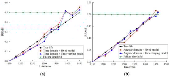 (a) Life prediction comparison of two models in the time domain; (b) life prediction comparison of two models in the angular domain.