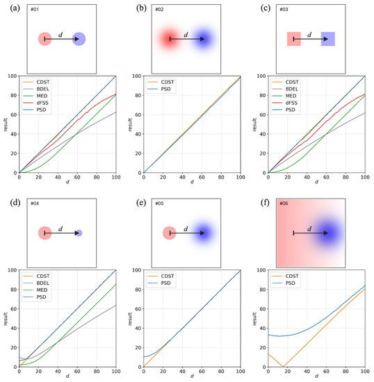 Figure 1 shows the first six comparisons denoted by indices #1 to #6. Comparisons #1–#3 (Figure 1a–c) use a single event of either circular, Gaussian, or square shape, with an identical but displaced event in the other field. The PSD and CDST give a near-perfect estimate of the actual displacement for the whole range of d values for the circular and square-shaped events. All other measures underestimate the displacement with the smallest underestimation provided by dFSS. For the Gaussian events, due to the events being non-binary, only PSD and CDST provide a result, with both giving a near-perfect estimate of the actual displacement for the whole range of d values.