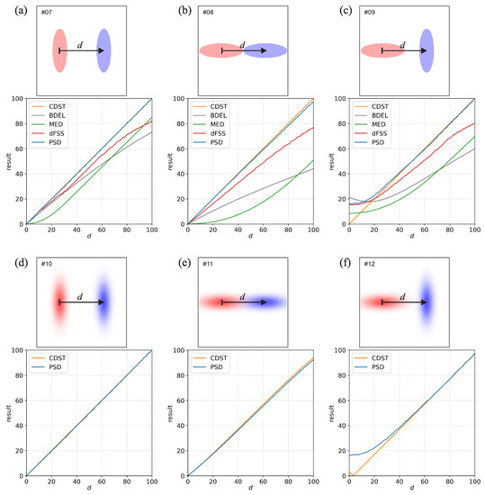 Figure 2 shows the six comparisons that use a pair of either binary or Gaussian events of elliptical shape in various combinations of displacement and orientation. Comparisons #7 and #8 (Figure 2a,b) use a pair of identically oriented binary elliptically events. The PSD and CDST give a near-perfect estimate of the actual displacement for the whole range of d values. All other measures underestimate the displacement with the smallest underestimation provided by dFSS. The underestimation is especially large for #8 in the case of MED and BDEL, which is again linked to the nearest-neighbor methodology they are based on (due to the horizontal orientation, one end of the ellipse will always stick quite far out towards the center of the other ellipse). In comparison #9 (Figure 2c) the two elliptical events are perpendicular, with all the measures, except CDST, providing a larger than zero result for . At , the PSD and CDST give an excellent estimate of the actual displacement, while the other measures underestimate it. For the comparisons #10–#12 (Figure 2d–f), with the non-binary Gaussian elliptical events, only PSD and CDST can provide results, which are very similar to the ones for binary elliptical events (comparisons #7–#9).