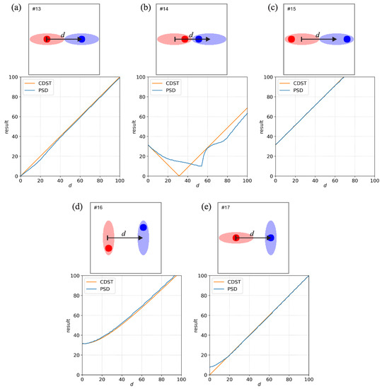 Since both fields in Comparison #14 are vertically symmetrical around the middle, the center of mass is located on the middle line. As d changes, the blue event is transposed in the left-right direction, and the distance between the centers of mass will change linearly—thus, the CDST will also change linearly with d. At approximately , the centers of mass of the two events are collocated, and . The behavior of PSD is roughly similar, with two local maximums at and 100 grid points and one minimum in the middle. The minimum of PSD is near when the two high-intensity regions have considerable overlap, while at the same time, there is also some overlap between the low-intensity regions.