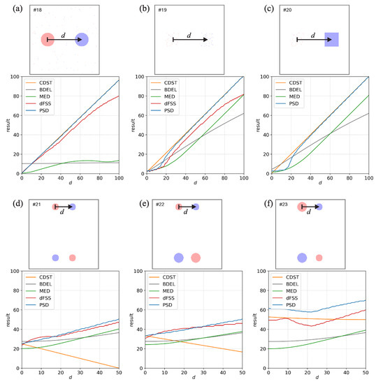 In comparison #23 (Figure 4f), the events in each set are biased—there is a larger and a smaller event in each set. Again BDEL values are almost identical to #21 for the same reasons as for #22. Surprisingly, MED values are also practically identical to #21. This behavior can be attributed to the nearest-neighbor methodology used by MED. Only the distance to the nearest event is evaluated, regardless of how big or small that event might be. On the other hand, PSD, dFSS, and CDST are markedly larger compared to #21. This behavior makes sense—since each set is biased, one could expect the displacement to be larger since the events of each set do not balance each other out perfectly. The behavior of CDST is nearly linear with respect to d, but its value does not change much. The center of mass of one field is located more towards the top, while the center of mass of the other field is more towards the bottom. The vertical distance between the centers of mass is larger than the horizontal (which depends on d) so the CDST does not change much with d. The behavior of PSD and dFSS is more variable and complex, with PSD consistently larger compared to dFSS. They both have a global minimum at approximately grid points and are larger for other values of d.