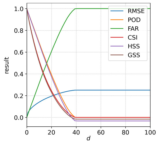 Figure 5 shows the results of six additional non-spatial measures for comparison #1 with the displaced circular events. Figure 5 can be compared with the bottom panel of Figure 1a, which shows the results of the distance metrics. The non-spatial measures are the root-mean-square-error (RMSE, [13]) and five measures based on contingency tables: the probability of detection (POD, also called hit rate), false alarm ratio (FAR), critical success index (CSI, also called threat score), Heidke skill score (HSS) and Gilbert skill score (GSS, also called equitable threat score). The description of the five contingency-table-based measures is available in [14].