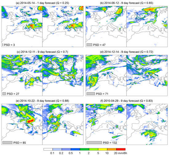 PSD for selected examples of 6-hourly operational ECMWF precipitation forecasts over Europe and North Africa. The domain size is grid points. The left panel of each figure shows the analysis precipitation, while the right panel shows the forecast for the same 6-h period. The gray bar in the lower-left corner represents the estimate of displacement provided by PSD. The value of the Q parameter is also provided in each panel title.