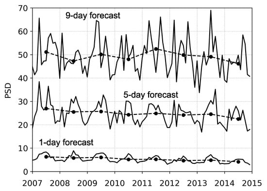 Finally, Figure 7 shows the analysis of time-series of ECMWF precipitation forecasts for the same domain as before. It shows the monthly and yearly averages of PSD values for the 6-h precipitation accumulations (0000–0600 UTC) in the period 2007-2014. There is a clear difference between the 1-, 5-, and 9-day forecasts, with the average PSD values being approximately 5, 25, and 49 grid points, respectively. The corresponding values of standard deviations of PSD are 2, 13, and 24 grid points. The relatively large standard deviations indicate a large spread of the PSD values that presumably reflect various weather situations that can be present in the analyzed domain. Nevertheless, the series of yearly averages of PSD values has a statistically significant decreasing trend for the 1-day forecast ( grid points/year, significant at ) and the 5-day forecast ( grid points/year, ). The 9-day forecast does not have a significant trend. A modified Mann-Kendall test that utilizes a trend-free pre-whitening method [16] was used to determine the statistical significance of a trend. The decreasing and significant trends of the 1- and 5-day forecasts show a clear improvement in the forecasting ability of the ECMWF model, with regards to spatial displacement of precipitation, despite the analyzed period of 8 years being rather short. The 1- and 5-day forecasts also exhibit a noticeable seasonal dependence of PSD values, with the forecast being better during the cold part of the year. The seasonal variation of the PSD value is likely linked to the frequency of occurrence of convective precipitation (which is more challenging for the model to predict since convection is a sub-grid process), which appears more frequently in the warmer part of the year.