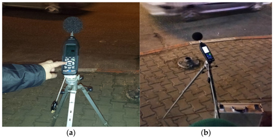 Noise measurement at the Maior Şonţu traffic light intersection: (a) placement of the sound level meter in the proximity of the traffic road flow; (b) road noise recording and analyzing.