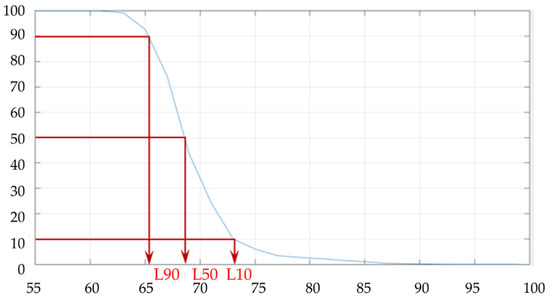 The results processing requires the increasing ordering of the obtained values and the grouping of the values on intervals with the 2 dB size, then using the Matlab program, the histogram of the distribution of LAF values is made (Figure 5). We observe a specific image of the normal distribution (Gauss’s bell), but also with values of the noise level exceeding the normal distribution in the field of higher values (at a visual estimate, there are values with about 4–6 standard deviations above the average). The processing of the obtained results consisted in the determination of the physical and psychophysical indicators for the distribution of values of the noise level obtained after the measurements (Figure 6). For simplicity, the usual L notation for noise level was used.