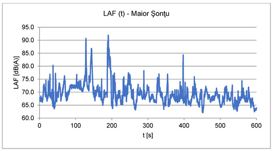 With the specific equipment for road noise measuring (the microphone placed at the distance and height prescribed by the standard) there was a continuous recording of noise. The total noise recording time was 10 min. The noise sampling interval was 0.125 s, which means a sampling frequency of 8 records per second-a high enough frequency to consider continuous recording over time. The LAF values were obtained by measurement, these being the noise level weighted according to scale A, specific to the road noise.