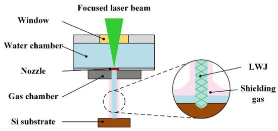 Laser waterjet machining is an emerging technique, in which a focused laser beam is delivered into a high-speed waterjet, forming a “fiber” unto the substrate surface. It should be pointed out that the wavelength and pulse duration of the laser source are mostly limited within 515–532 nm and 100–300 ns, respectively. The reasons can be analyzed from two aspects. First of all, the linear absorption coefficient of pure water is relatively low at 515–532 nm compared with its infrared wavelength [6]. Moreover, the laser-induced water breakdown can be effectively avoided at a longer pulse duration [7]. Degassed filtered water is pumped in to the water chamber at 10–50 MPa considering the nozzle diameter. Specifically, higher water pressure is capable of being admitted for a smaller nozzle diameter and the widely adopted nozzle diameter ranges from 30 μm to 200 μm [8]. The ejected LWJ ablates the substrate and constructs the micro-structures.