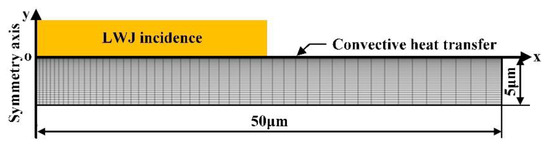 The numerical simulation was carried out under the circumstance of COMSOL Multiphysics. The CFD (computational fluid dynamics) module and heat transfer module were used for model setup. A two-dimension symmetrical calculation domain and the corresponding mesh generation is illustrated in Figure 3. The size of the calculation domain was 50 μm × 5 μm. It should be noted that the LWJ impinged on the upper surface of the domain and the radius of LWJ was 25 μm. In order to improve the computational accuracy, the upper boundary of the domain was refined. The minimum mesh size was 100 nm (length) × 50 nm (width).