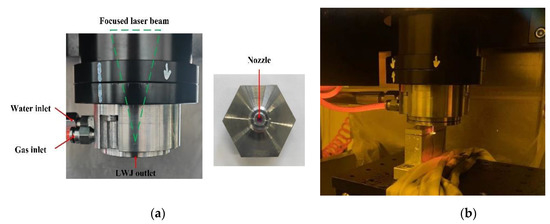Demonstration of LWJ machining. (a) Laser waterjet coupling device; and (b) capture of machining process.