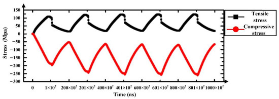 To further clarify the ablation mechanism of the silicon substrate, the temporal evolution of major principal stress in the calculation domain is demonstrated in Figure 8. The generation of maximum compressive stress was always delayed after the tensile stress. Both of these two stresses increased during the laser pulse, then gradually dropped during the pulse interval. The compressive stress dropped much faster than tensile stress. The spatial distributions of maximum compressive and tensile stress in the calculation domain at t = 100 ns are illustrated in Figure 9. Both tensile and compressive stresses concentrated on the right side of the domain and restricted within a relatively small area. Most importantly, the maximum compressive stress and tensile stress were far lower than the compressive strength and tensile strength, respectively.