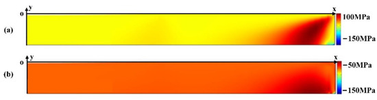 The spatial distribution of (a) maximum tensile stress and (b) maximum compressive stress.