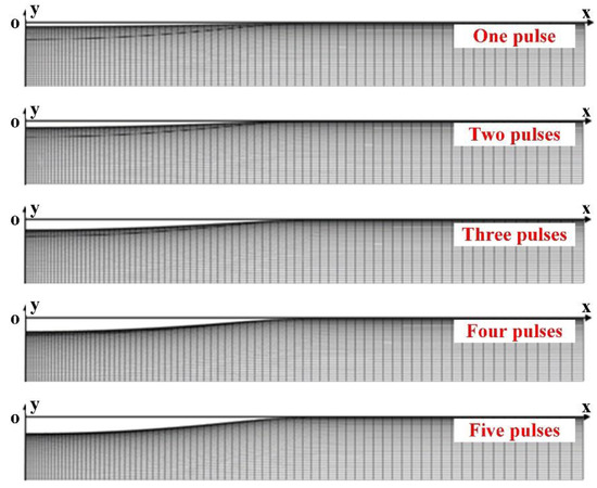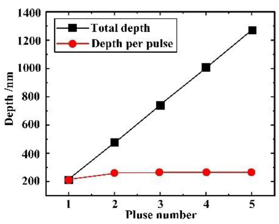 As can be observed from Figure 10, Figure 11, and Figure 12, the ablation depth increased with applied pulse number. However, an obvious difference could be discovered between the simulation and experimental results. According to the simulations, the first laser pulse resulted in the smallest ablation depth(215 nm). The ablation depth induced by the second laser pulse increased to approximately 260 nm. The following three pulses led to the same ablation depth (265 nm). However, the ablation depth per pulse decreased significantly with increasing applied pulses in the experiments. The main reasons could be analyzed as follows: