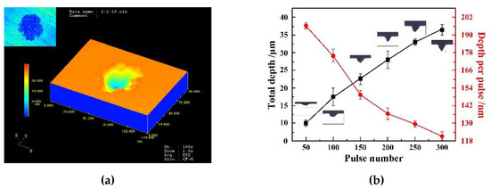 (a) Typical pit morphology at pulse number of 300 and (b) evolution of ablation depth under different pulses.