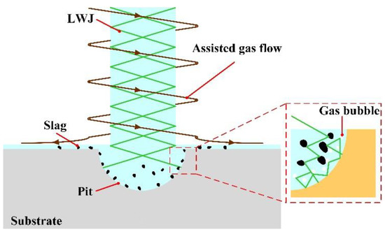 In the simulations, it was assumed that the material was peeled off clearly from the substrate once its temperature exceeded the melting point. The laser beam was capable of interacting with the substrate continuously, and this process was accompanied by the scouring of waterjet. The next ablation step was not disturbed. Meanwhile, in the experiments, the formation of the micro-pit, slag, and gas bubble induced by the initial several laser pulses altered the transmission behavior of the laser beam in the following ablation process, as demonstrated in Figure 13. In specific, the pit enabled the deposition of water, during which the impingement of high-speed LWJ resulted in significant turbulence. The gas bubble was strained within the deposited water and the slag was stirred, forming a “suspension”. The incident laser was reflected, refracted, and absorbed by the “suspension”, causing the serious energy dissipation. The subsequent ablation was weakened correspondingly. The scouring of waterjet could suppress this phenomenon to some extent, but still could not eliminate it completely.