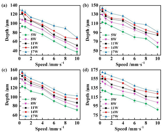 The variation of groove depth under pulse energy of (a) 0.45 mJ, (b) 0.65 mJ, (c) 0.85 mJ, and (d) 1.05 mJ.