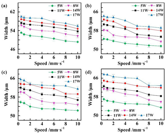 The variation of groove width under pulse energy of (a) 0.45 mJ, (b) 0.65 mJ, (c) 0.85 mJ, and (d) 1.05 mJ.