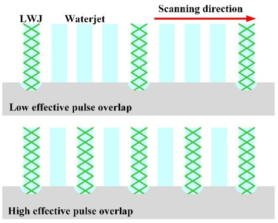 Nevertheless, the groove width was not sensitive to these parameters. The reason is that during single-row LWJ scribing, the laser power was trapped within the waterjet. The increase in laser pulse energy and power may not alter the working state of LWJ. Referring to Figure 13, the limited refraction and reflection of the laser beam within the deposited water in the machining region led to the slightly broadening of groove width. The increase in scanning speed could suppress the water deposition to some extent as it provided a better drainage channel under the assisted argon atmosphere, but it still hardly influenced groove width [22].