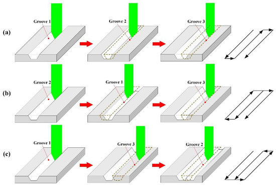 Groove morphologies fabricated by (a) 123 sequence, (b) 213 sequence, and (c) 132 sequence.