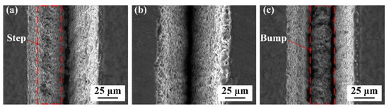 According to the single-row experimental results, higher laser pulse energy and relatively small scanning speed were fundamental factors for fabricating deeper grooves. On this basis, multi-row scanning strategies were investigated from two progressive aspects. First of all, three scanning strategies on the same layer were put forward, the schematic of which are illustrated in Figure 17. The groove morphologies are shown in Figure 18, and the corresponding machining parameters are listed in Table 4. An obvious step structure could be discovered on the groove wall fabricated by 123 sequence, which could be attributed to the asymmetric scanning trace. Specifically, the construction of groove one provided a unilateral channel for water ejection. During the construction of groove two, The refracted and reflected laser beam in the deposited water enhanced the unilateral ablation, which resulted in the remodulation of the groove wall and the formation of the step structure. For 132 sequence, the construction of groove one and three generated the bumpy structures in the central area. This structure could “split” the incident LWJ, forming a symmetric distributed pool for water deposition. The refracted and reflected laser beam in this channel suppressed the construction of groove three, as the laser energy was dissipated to enhance the ablation of groove one and groove two where the effective LWJ was absent. In contrast, a clearly V-shaped micro-groove with no step and bump structures was obtained through 213 sequence. The well morphology should be given credit for the formation of the central water channel after the construction of groove two. In specific, the LWJ could interact with the side wall of groove one and groove three directly without the disturbance from deposited water. The slag could be ejected from the groove fluently as well. Therefore, 213 sequence was the most appropriate scanning strategy on the same layer.