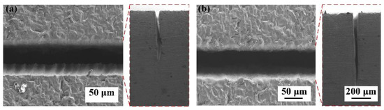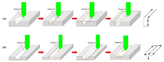 Based on the above analyses, two scanning strategies along the depth direction was raised, and the schematic is shown in Figure 19. The corresponding groove morphologies are shown in Figure 20, and the machining parameters are listed in Table 5. The surface-to-depth sequence offered larger DTWR and lower taper. Analyses showed that under the assistance of the argon atmosphere, the larger ablation region enabled the deposited water and slag to eject fluently. The LWJ could be delivered to the deeper position of the micro-groove instead of being dissipated. However, the application of depth-to-surface sequence weakened the water and slag ejection seriously along depth direction. The reflection and refraction of the laser beam within the deposited water induced extra damage to the groove wall, and the enlargement of DTWR was prohibited.