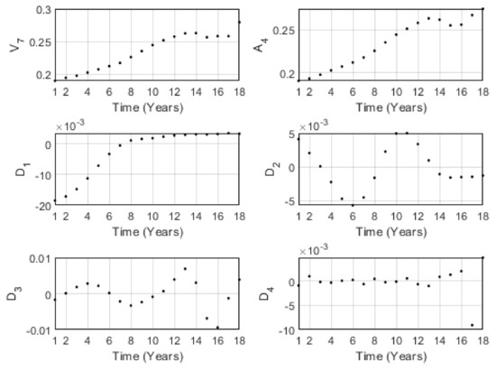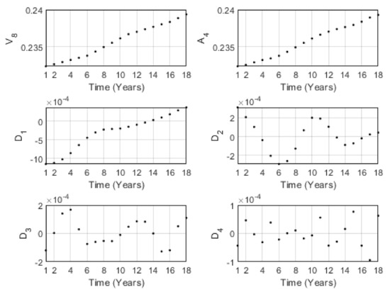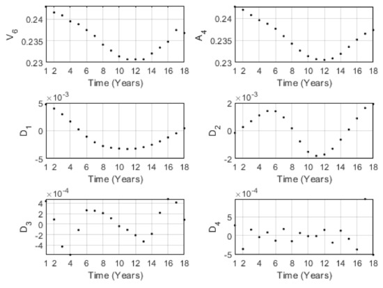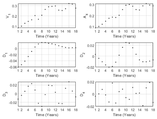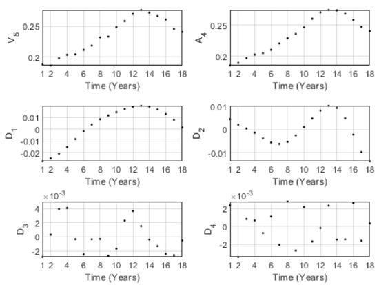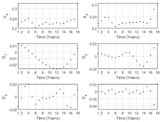 Next, we provide the wavelet multiscale analysis of each variable at the level 4, using herewith the well-known Daubechies wavelet Db8 (See [34]). Table 2, Table 3, Table 4, Table 5, Table 6, Table 7, Table 8 and Table 9 represent the four components due to the four-level wavelet decomposition. The first column in each table represents the approximation component relative to each variable, and the second, third, fourth, and fifth columns represent, respectively, the detail components , , , and already for each variable.