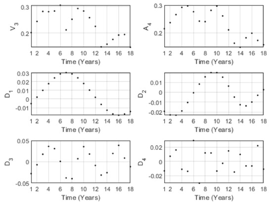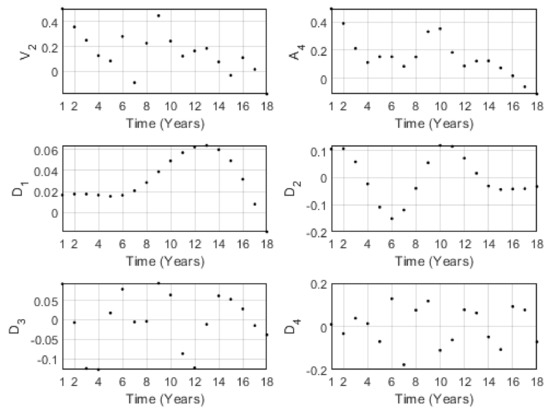 belongs to the space , and it is called the detail component of at the level j. It reflects the higher frequency oscillations or the fine-scale deviations of the series near its trend. As a consequence, the wavelet decomposition of in (A9) is a superposition as