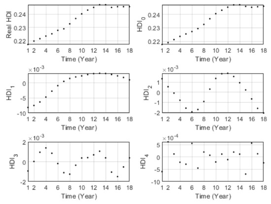 Notice that in model (1), we get a global index relative to a whole period, which may not reflect the real situation during localized times, as it did not take into consideration the time scale. To improve the model and exploit the time scale’s role and influence, we proposed to implement a multiscale QoL index by considering multiple time periods. We estimate a relative HDI according to a time scale , for which