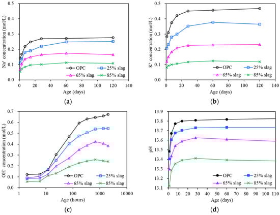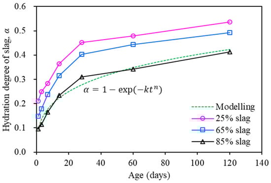 - The hydration kinetics of ultrafine slag powders can be well predicted using Avrami’s equation. With increases in slag addition, the amount of calcium hydroxide was decreased while the ettringite content was found to be increased. The dilution effect dominated the pore solution chemistry. By adding 85% slag, the pH value decreased to a level below 13.4 and tended to be reduced slightly in the long term owing to the continuous hydration of the slag.