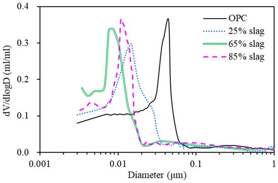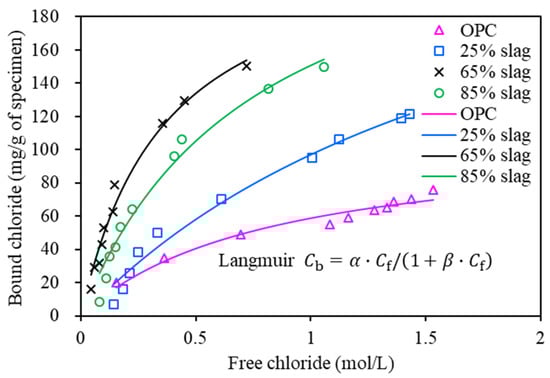 - The lowest chloride penetrability was found by incorporating 65% slag, whereby the pore structure was significantly refined, delaying chloride diffusion. Meanwhile, the pore solution chemistry, including OH− and SO42−, was diluted, together with a high amount of hydrotalcite, promoting chloride binding. The effect of slag addition on chloride binding behavior agrees well with the Langmuir isotherm.